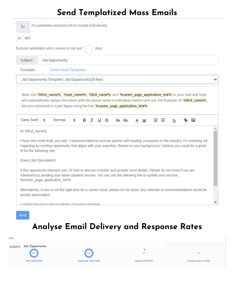 Search and send bulk mailer campaigns with Email templates to your archived candidates to collect updated resumes. Send auto response forms to candidates to collect additional details like Salary data.