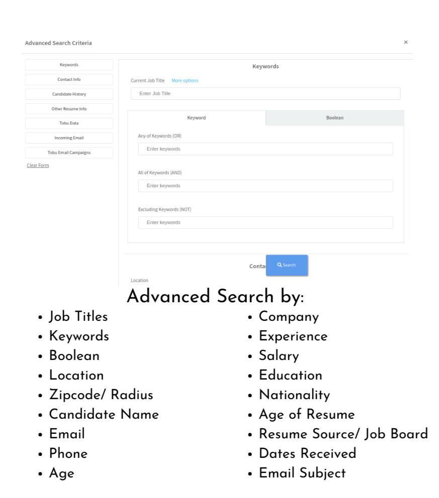 Works with Gmail, Outlook, Windows and Mac Desktops, Google Drive, One drive and many more. Tobu builds the database automatically. Search and Place Candidates from your Own Private Database